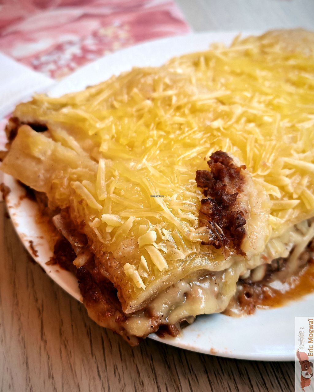 Lasagna, tomato sauce, plant-based mince, homemade vegan béchamel sauce, and plant-based cheese.