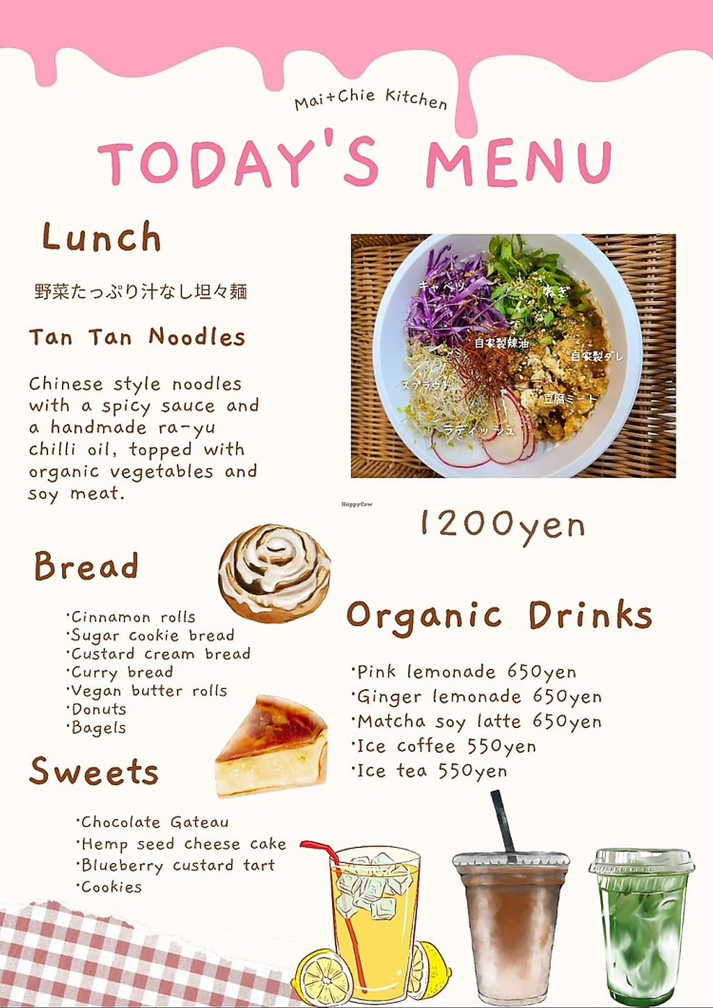 Maichie Kitchen recently opened and they’re one of the only fully vegan shops in Hiroshima! They’re open on Fridays, Saturdays and Sundays from 11am to 5pm and sell lots Japanese-style breads and desserts. They’ve got a little eat in space which is cosy and relaxing. They make a hemp cheesecake which is really nice and have other things like cinnamon rolls, donuts, cakes, cookies, tarts and some special bread based things that are unique to japan. They have a nice drink menu with a cute pink lemonade and matcha latte and do one or two main lunch meals which change depending on the season- like a tan tan ramen, sesame miso ramen and vegan burgers . They’re also making handmade fermented hemp and cashew artisan hard and soft cheeses, which go nicely with their organic sourdough bread. They have their own handmade chocolate bars- including a matcha white chocolate bar. The first lunch was a spicy tan tan noodle bowl and the next week will also have burgers and sushi. They make everything with organic ingredients and don’t use things containing artificial additives, preservatives or chemicals.