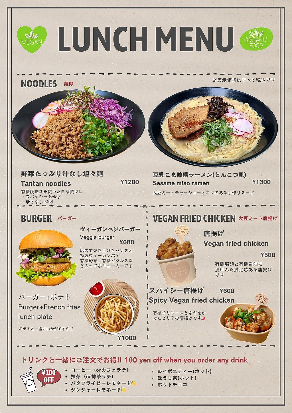 The food was absolutely delicious (we had two vegan burgers, a cafe latte and a matcha latte with cinnamon rolls and red bean bun), everything was so tasteful that we came back the day after (Sunday) !