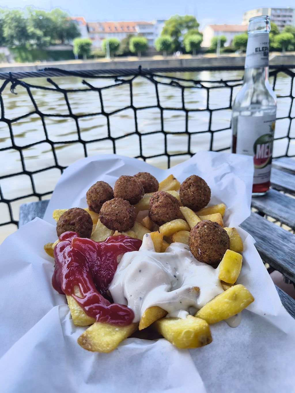 Man sitzt auf einem Boot auf dem Main und hat die beste Aussicht! Außerdem gibts echt ne große Auswahl an veganen Sachen. Super lecker und die Preise sind auch voll ok!