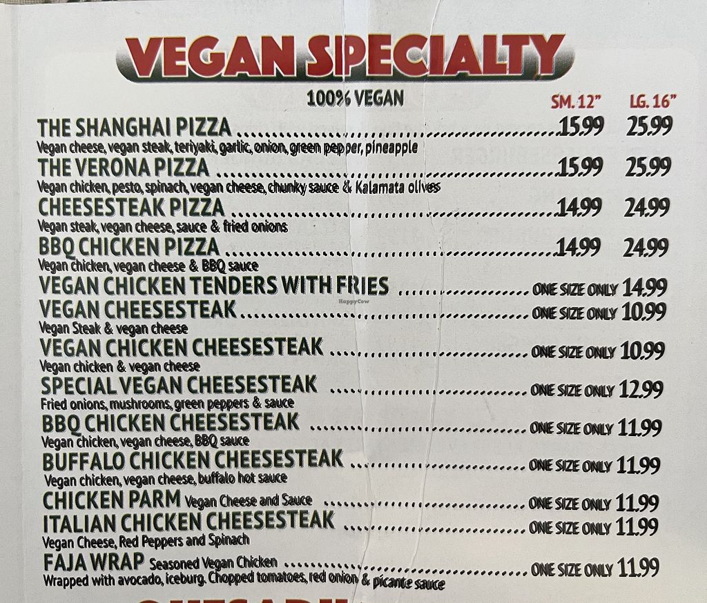 Went in with a few friends and got a vegan veggie pizza and vegan buffalo chicken cheesesteak, everything was delicious! They even brought out some desert (not sure what it was, kinda like a funnel cake churro fusion lol) the staff was really nice and accommodating of our mostly vegan group. Would definitely return if I’m in the area again!