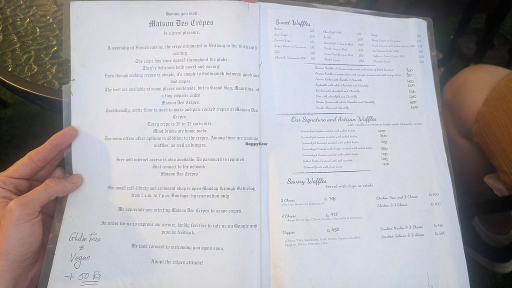 Serves meat, vegan options available. French crepe house offering vegan choices including savory and sweet crepes, waffles and burgers. Open Mon-Sat 8:00am-7:00pm, Sun 3:00pm-6:00pm.
