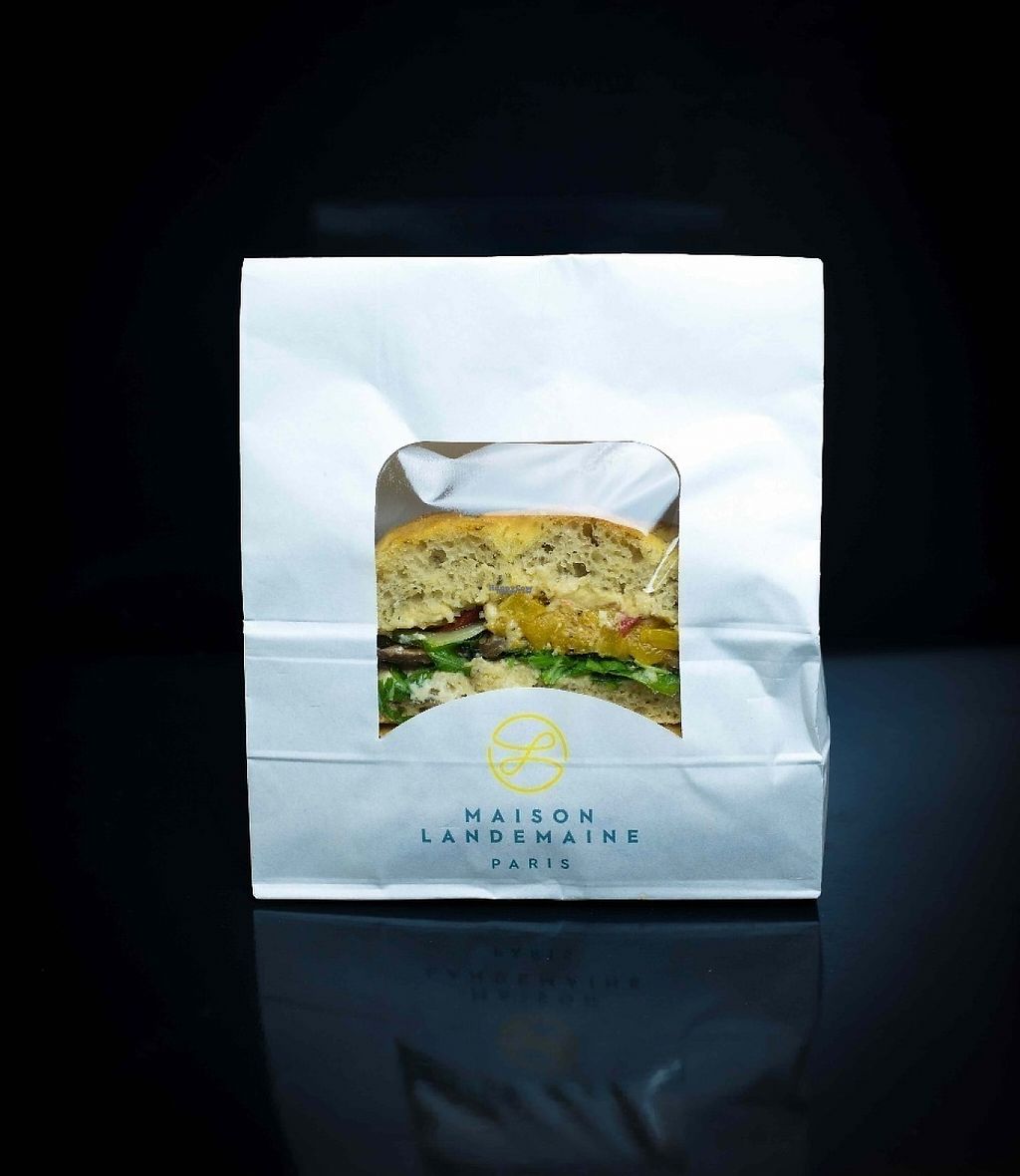 Sandwich made with focaccia bread, baked vegetables and houmous.