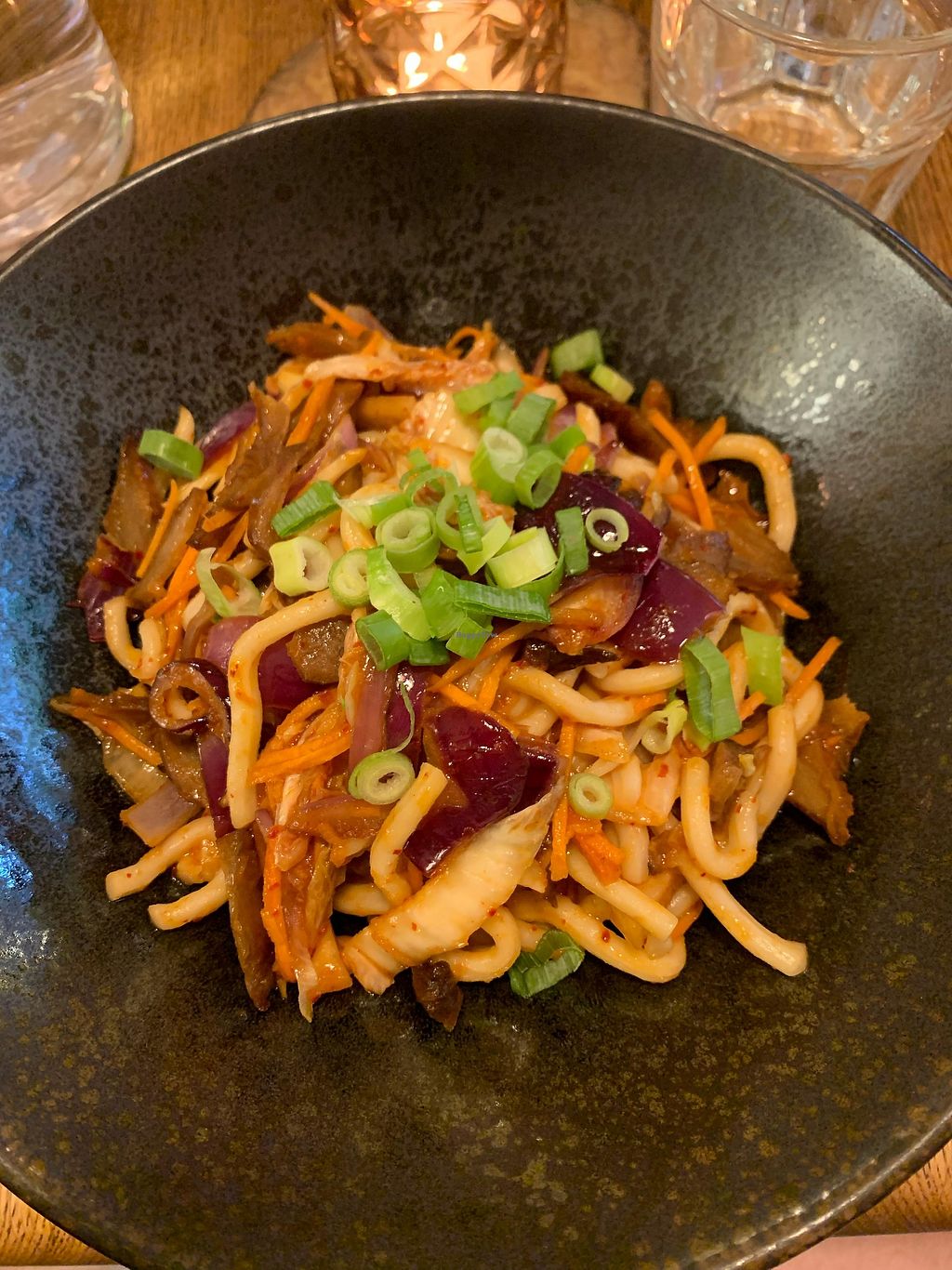 The food was excellent, the staff lovely and the space really fun. And, despite what you would think reading the menu, the food was quite light; We had the Tofuie Gras, "Duck" Pancakes and Udon Noodles, and we walked out feeling fine.