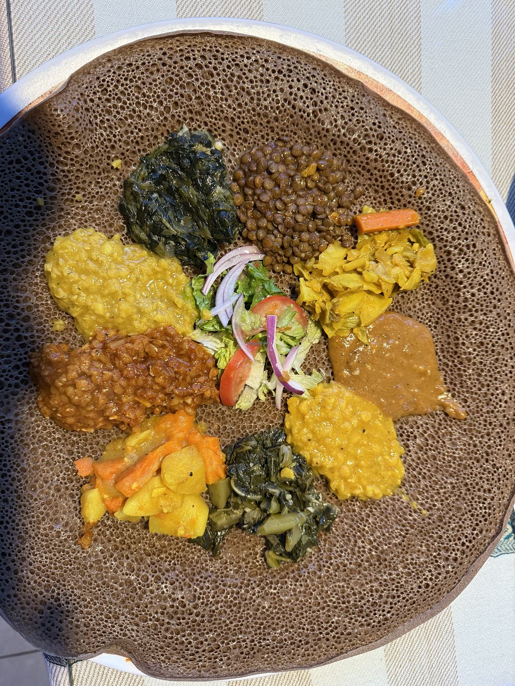 Full entree portions of Spicy Dinich Wot, Quosta, Tikil Gomen, and mil…
