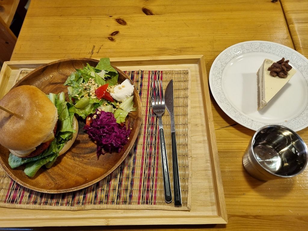 샐러드를 곁들인 비건 버거 세트와 감귤 무스 케이크