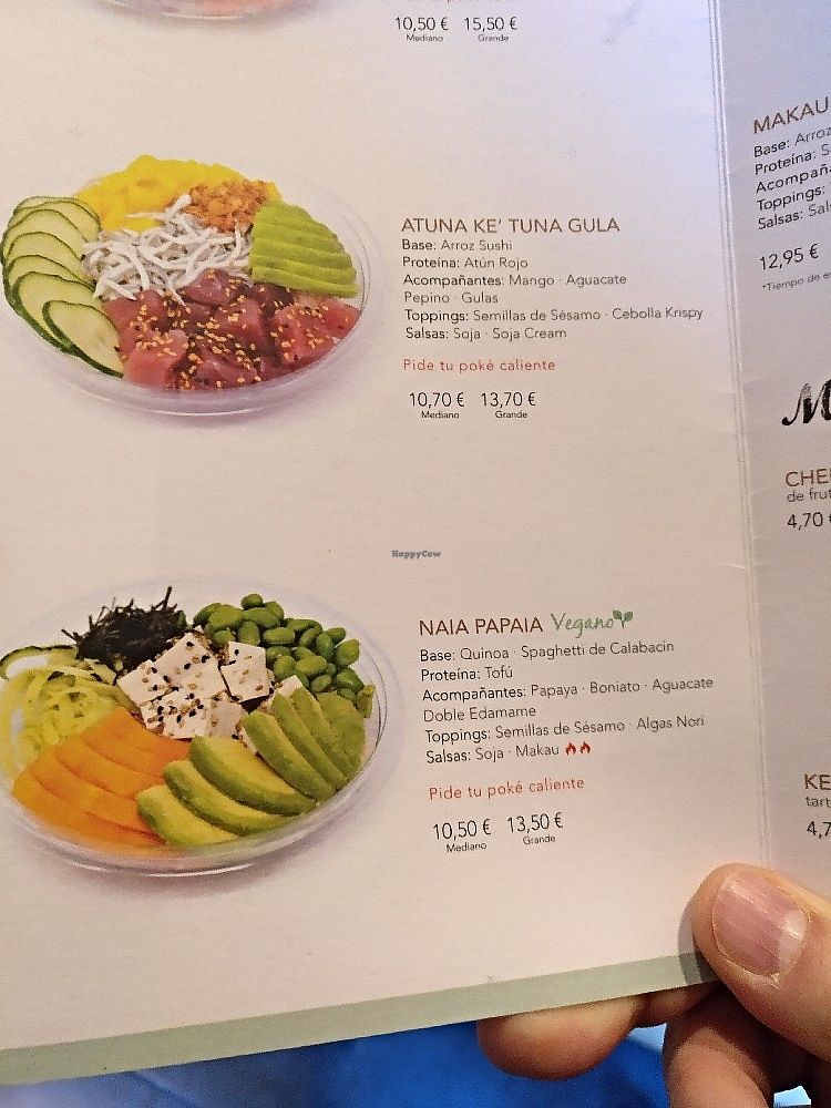 You can build your poké from scratch by choosing your favourite ingredients. However I ordered the "Naia papaia" poké which is labeled as vegan in the menu. It was really delicious combination of veggies with a tasty dressing, except for the tofu, which wasn't precisely the best tofu available in the shops. A large poké (which is just the right size for a lunch) and a drink sum up around 16€, which from my point of view is a bit too expensive for what in the end it's just a salad.