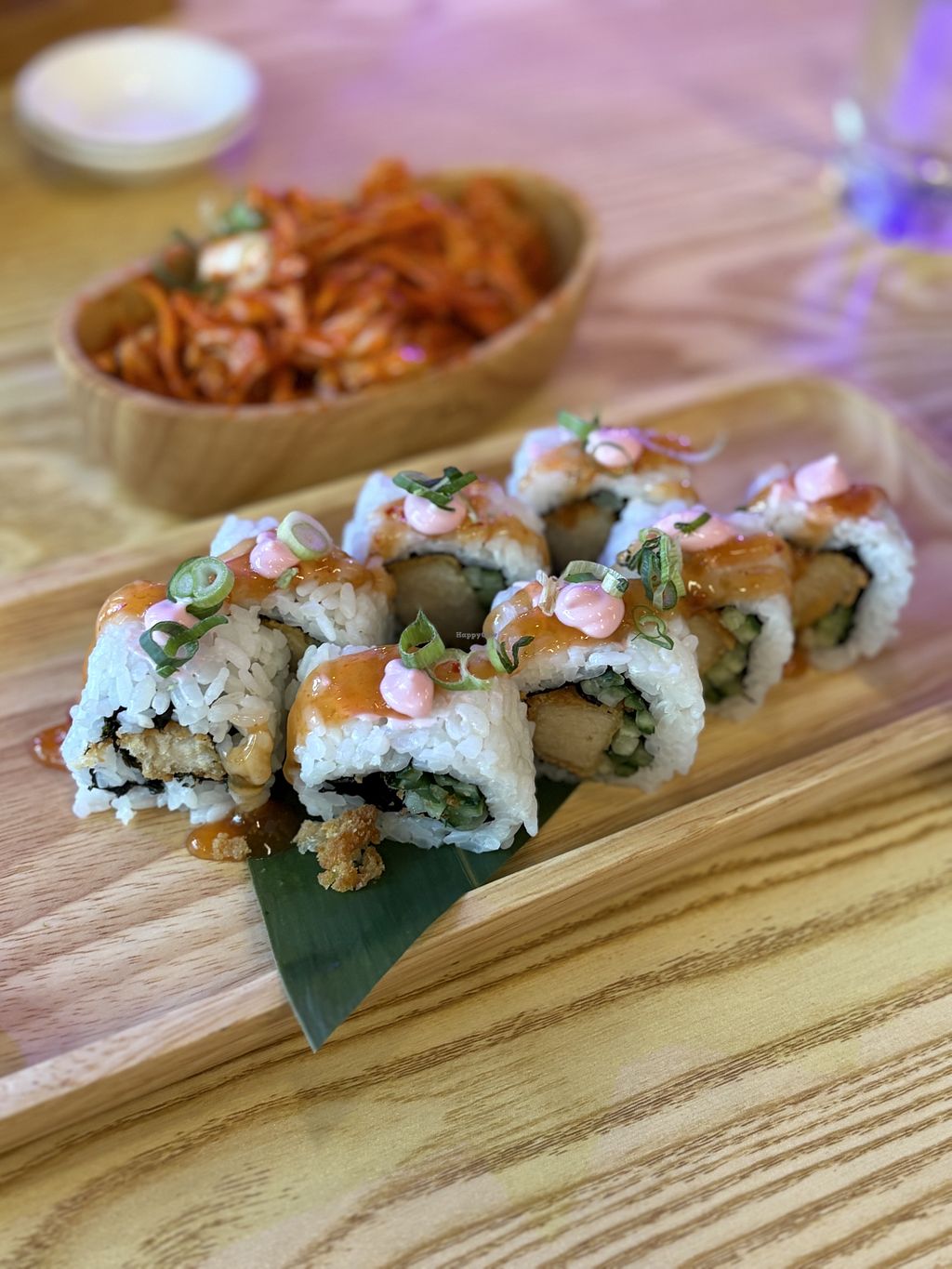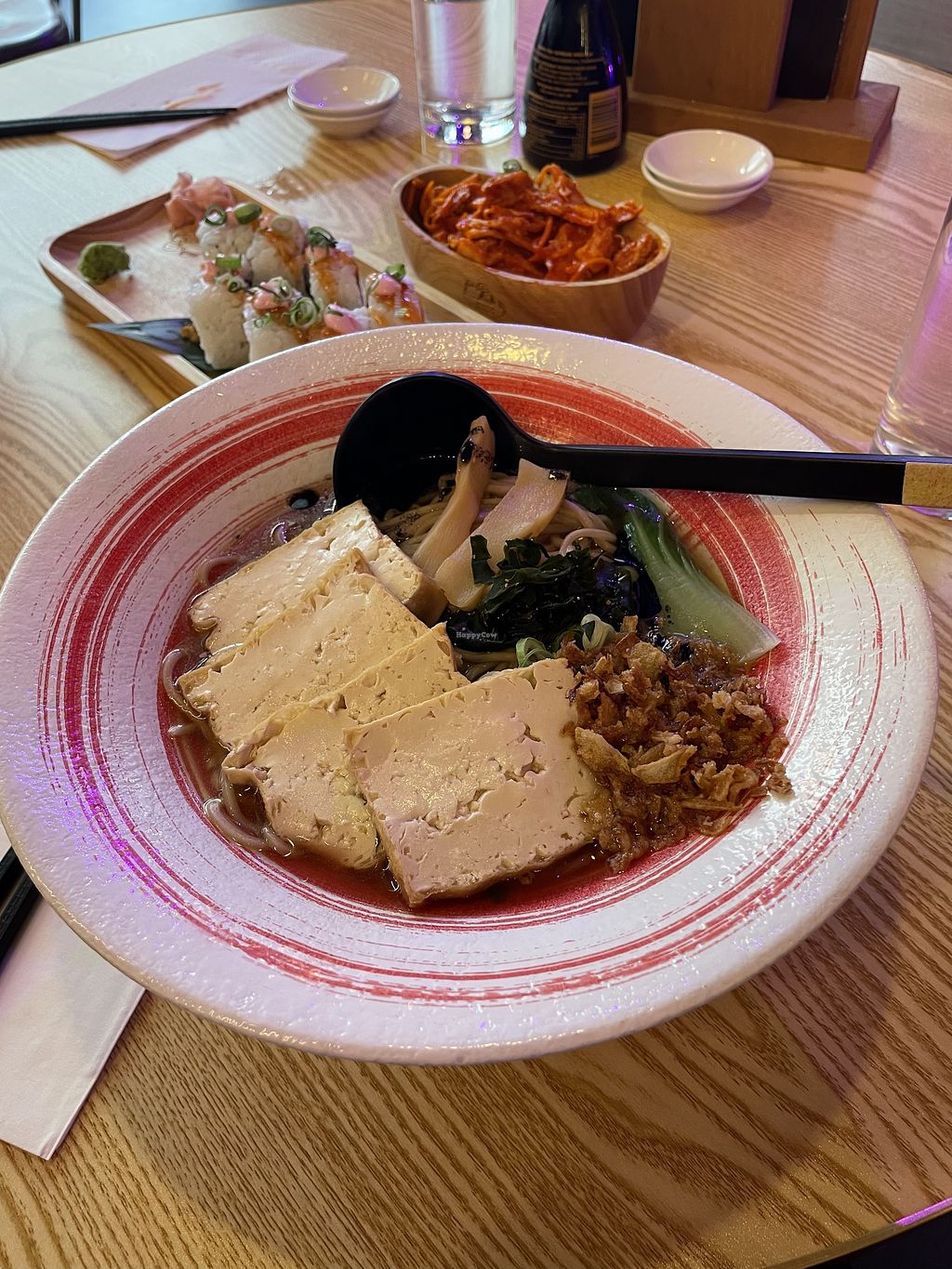 The ramen, sushi and kimchi with sushi we tried were all delicious and the service was very quick. The menu was clearly labelled and the staff were friendly and accommodating. There is a good selection of vegan ramen here, all clearly labelled on a separate page for vegans. They have tofu and vegan bacon options for toppings as well as vegan chicken, tofu and pumpkin options for sushi. There are no vegan dessert options.