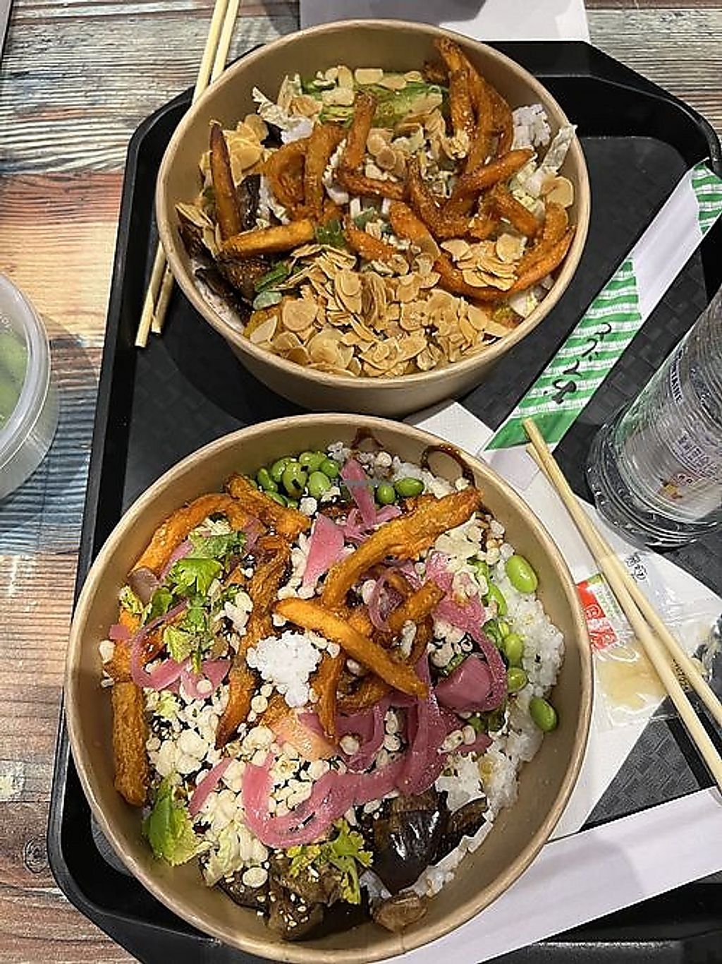 Serves meat, vegan options available. Japanese restaurant with vegan choices. Menu includes sweet potato bowl, edamame, seaweed salad, and vegetable gyoza. Open Mon-Sat 11:30-21:00.
