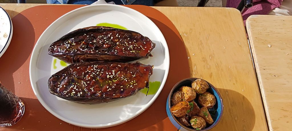 Tasty tahini covered roast aubergine, Mediterranean vegetables, fennel roasted potatoes, citrus dressed salad, hummus. Very friendly service and great view