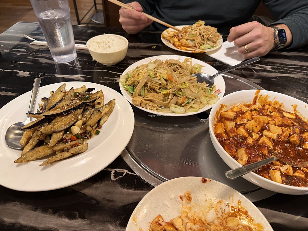 Serves meat, vegan options available. Restaurant offering veganizable dishes like “Mapo Tofu” (request vegetarian, no pork), spicy garlic eggplant, mixed vegetable hot pot, and various noodle dishes (confirm no egg or meat). Open Mon-Tue 11:00am-9:00pm, Thu 11:00am-9:00pm, Fri-Sat 11:00am-9:30pm, Sun 11:00am-9:00pm. Closed Wed.