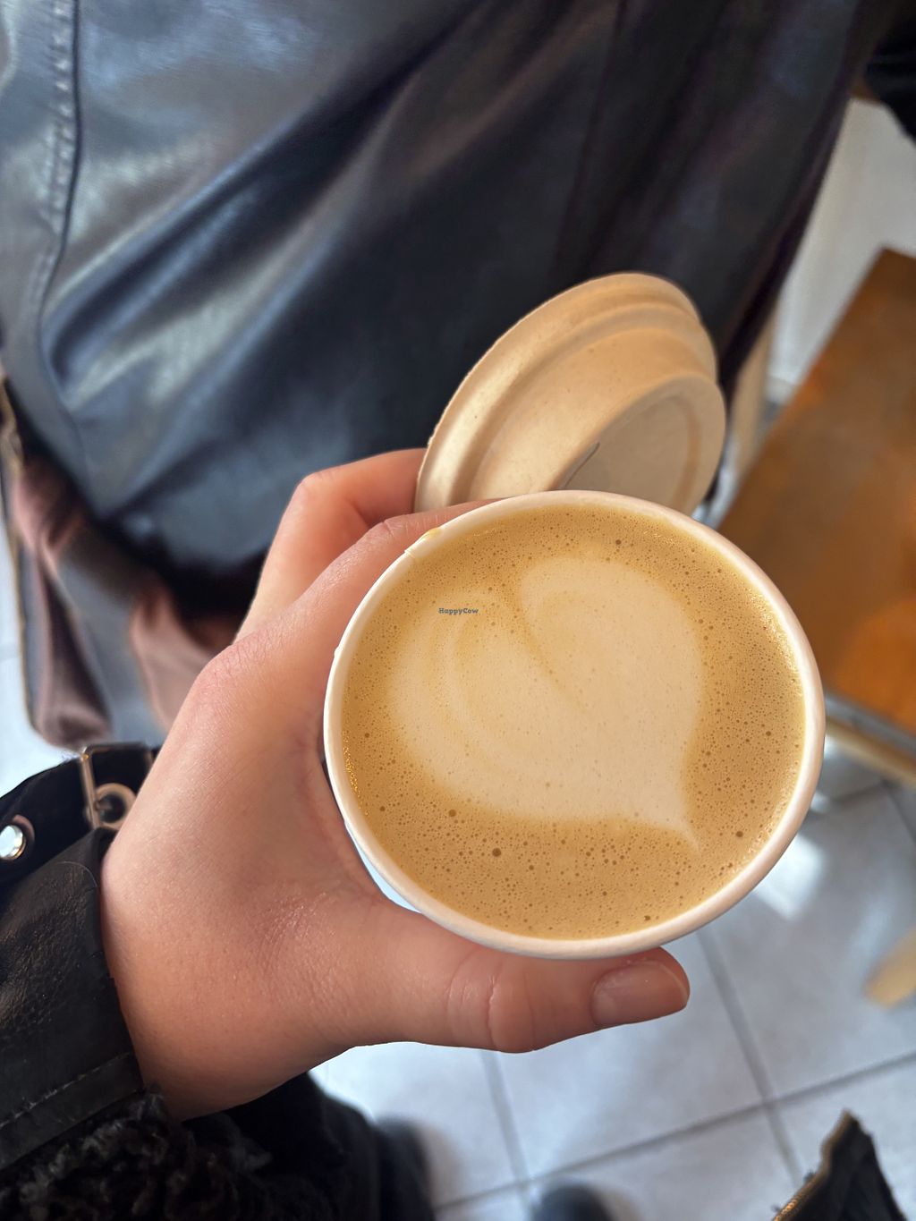 We ordered a capuccino with oatmilk and a green tea to go, both drinks was great. They have bamboo mixing stick and paper takeaway lid for the cup. I highly recommended this place. The owner (?) was very kind.