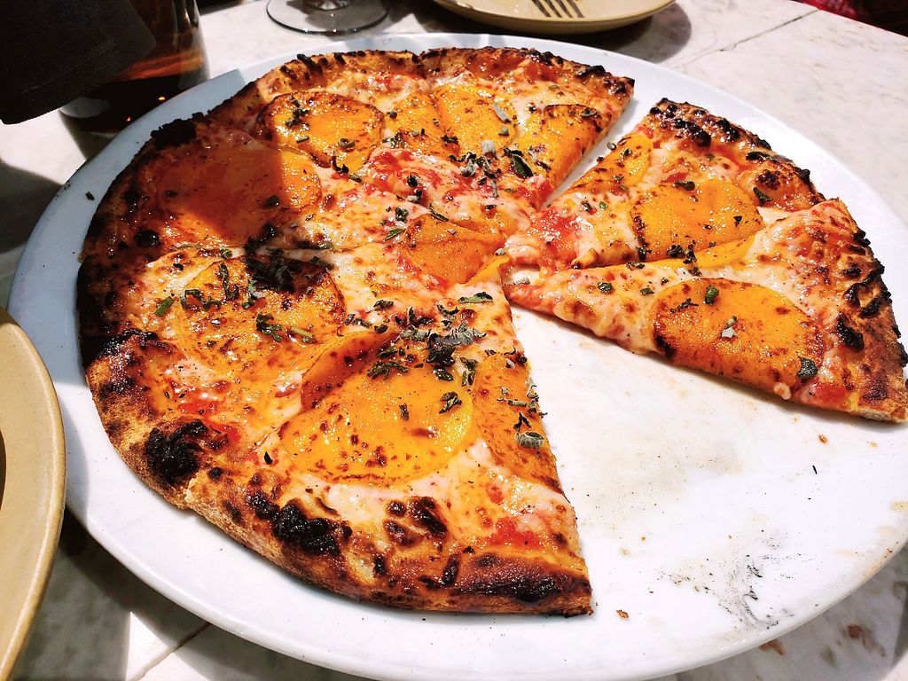 Vegan butternut squash pizza with no honey, added mushrooms.