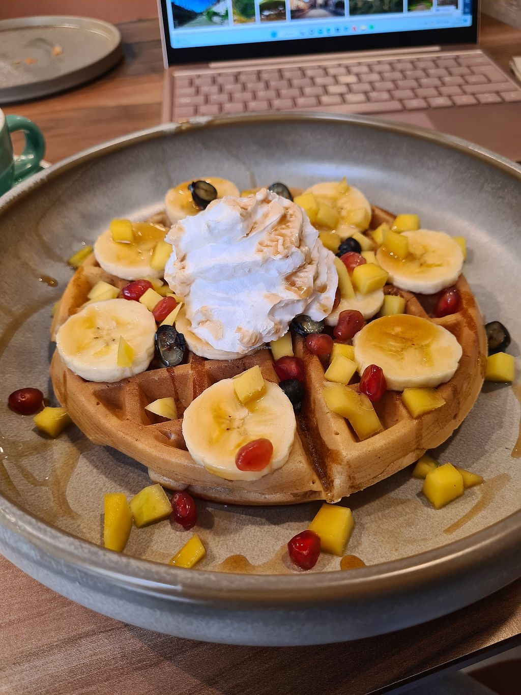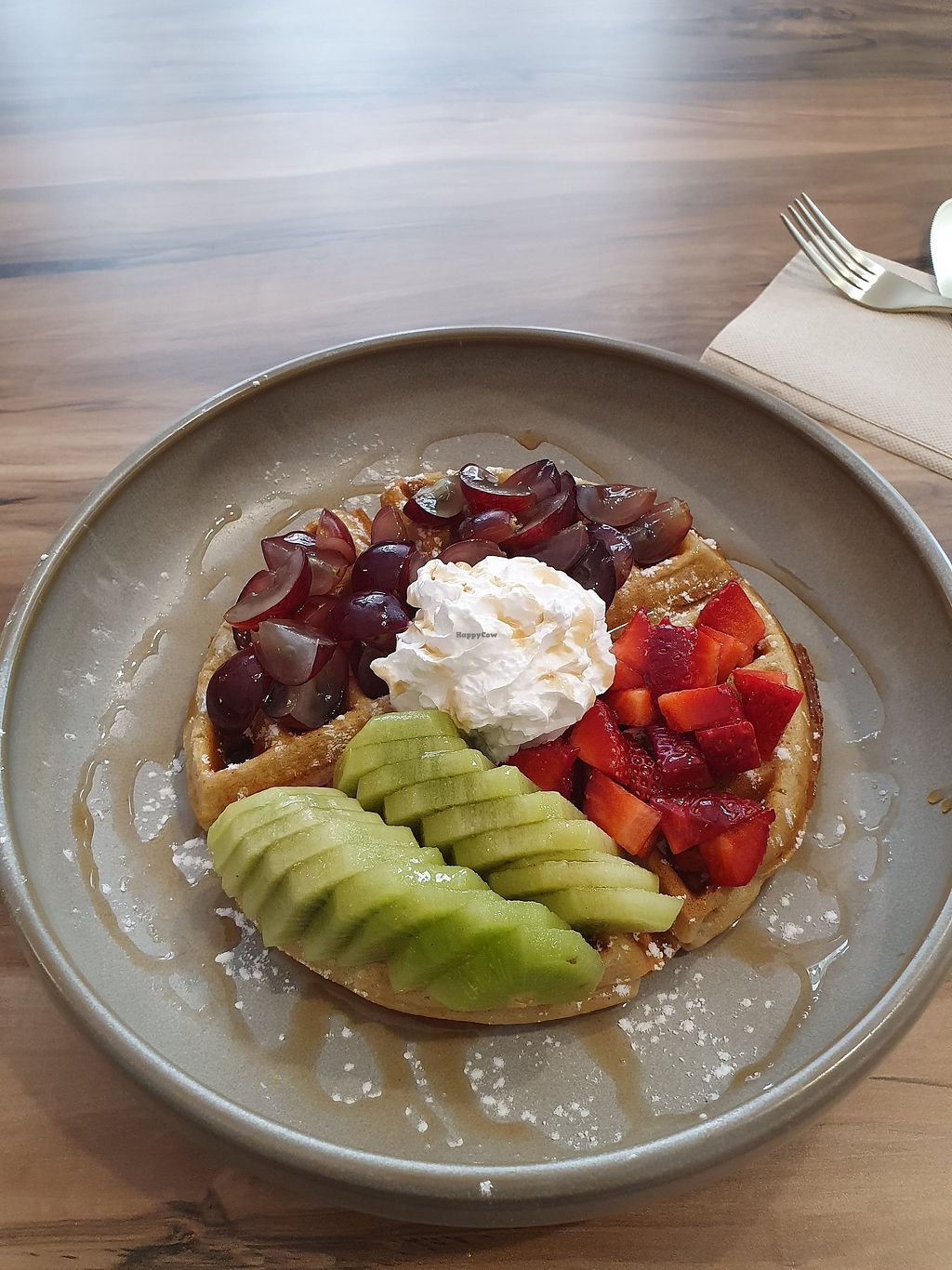 Waffles with different fruits. Awesome. Perfect for a small Snack for two peoble.