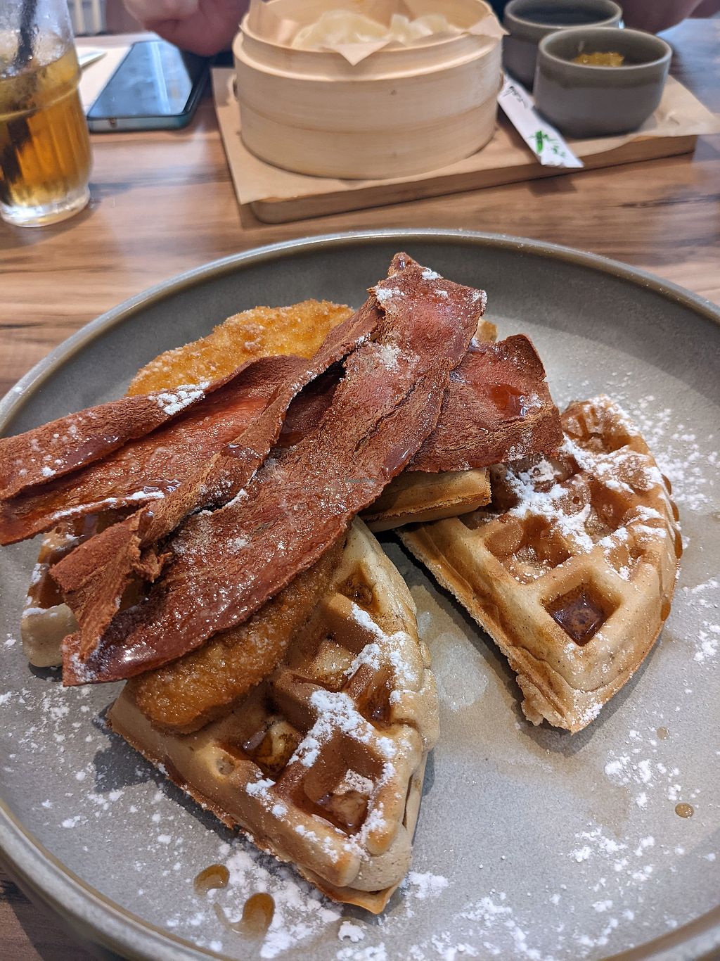 The selection was good. They have a lot of vegan options. I had the Vegan Chicken and Waffles (and added a soft boiled egg). And my wife had The Queen of Gluttony. The vegan chicken was prepared very well. If you’ve had this kind of chicken before you’ve probably had a piece that was hard as a rock. This one was perfect. The waffles were fluffy with maple syrup, powered sugar, and just a hint of cinnamon. The vegan bacon was also perfectly prepared.