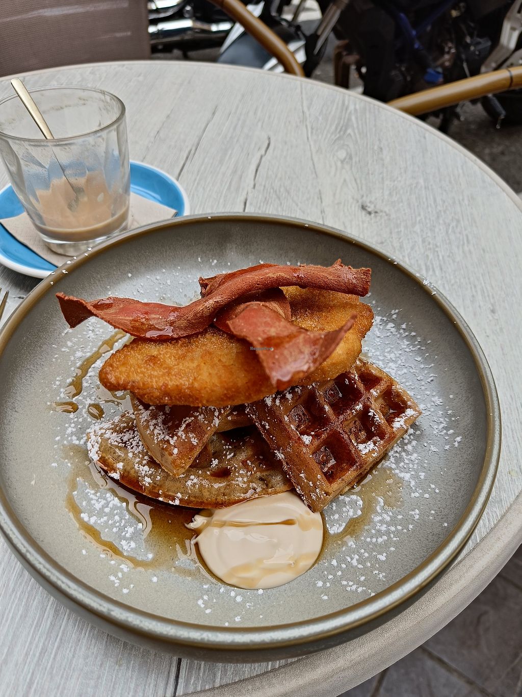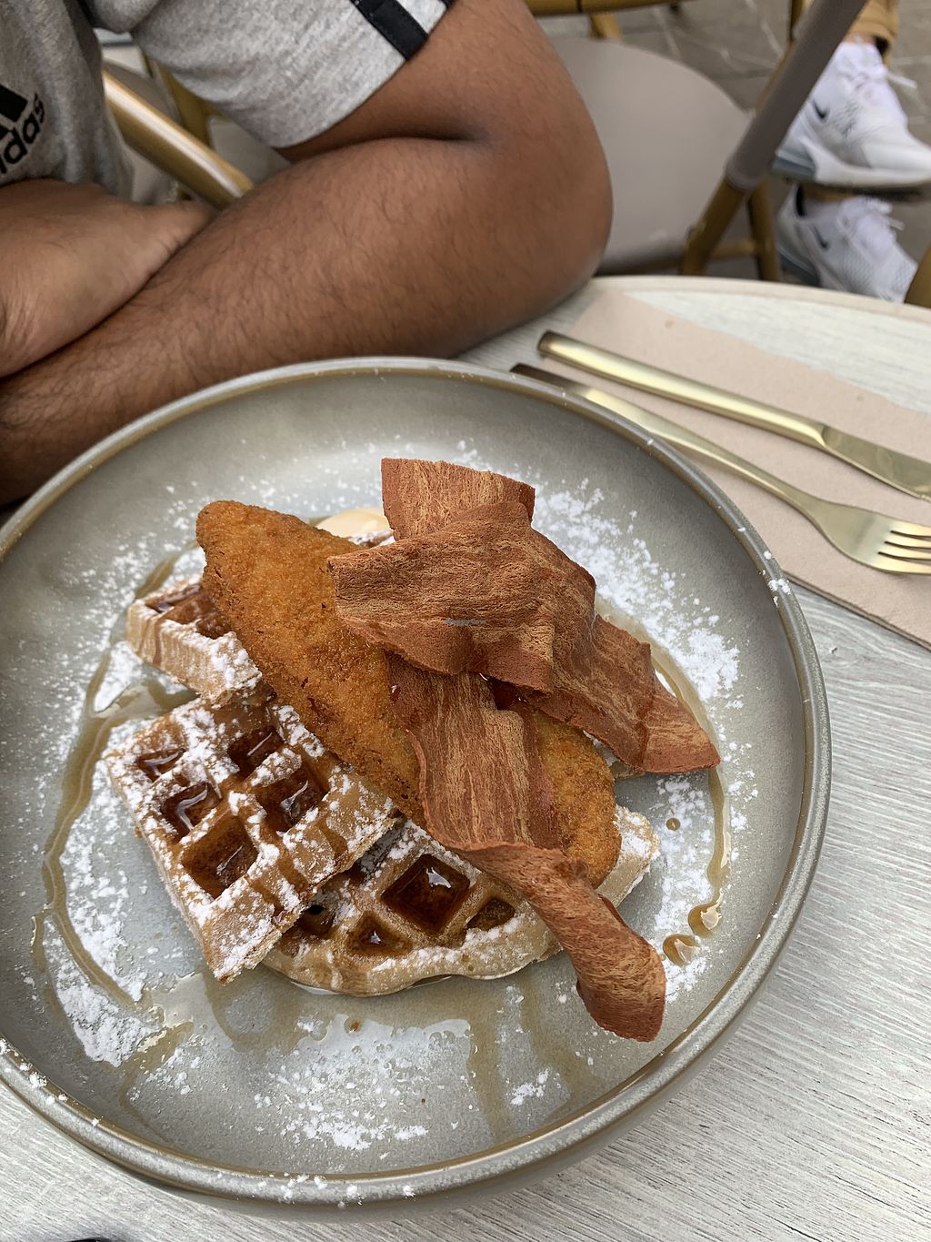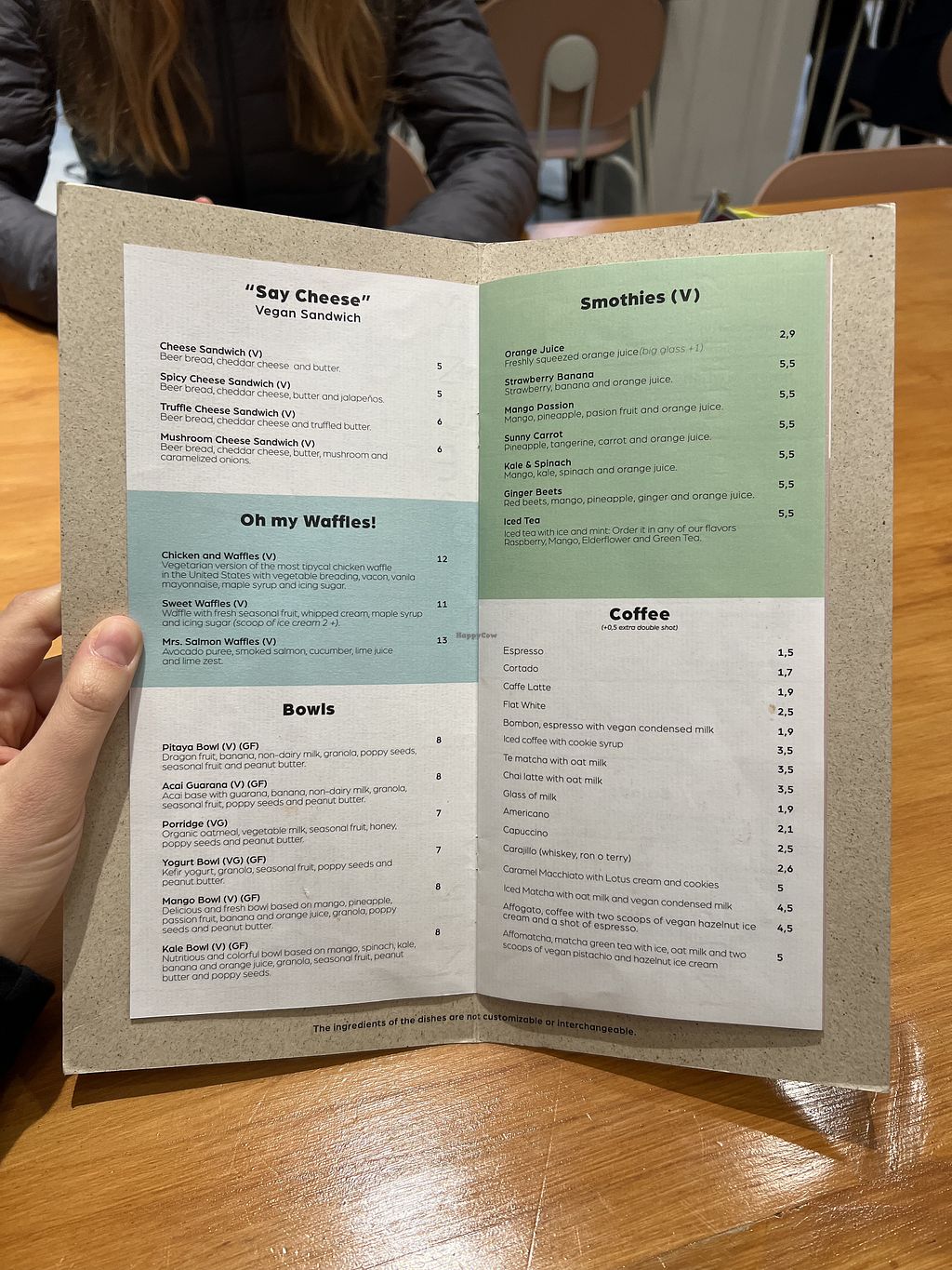 They have lovely food, price/quality ratio is great in my opinion. One thing I found a bit bizarre is that vegan options are marked as V and vegetarian as VG, which is the opposite of regular marking literally everywhere in the world. Lots of exciting options were vegetarian and wasn’t possible to swap regular cheese with vegan one for some reason. Waffles with chick’n is a fantastic dish, highly recommend, we’ve also tried chick’n burger - insanely good.