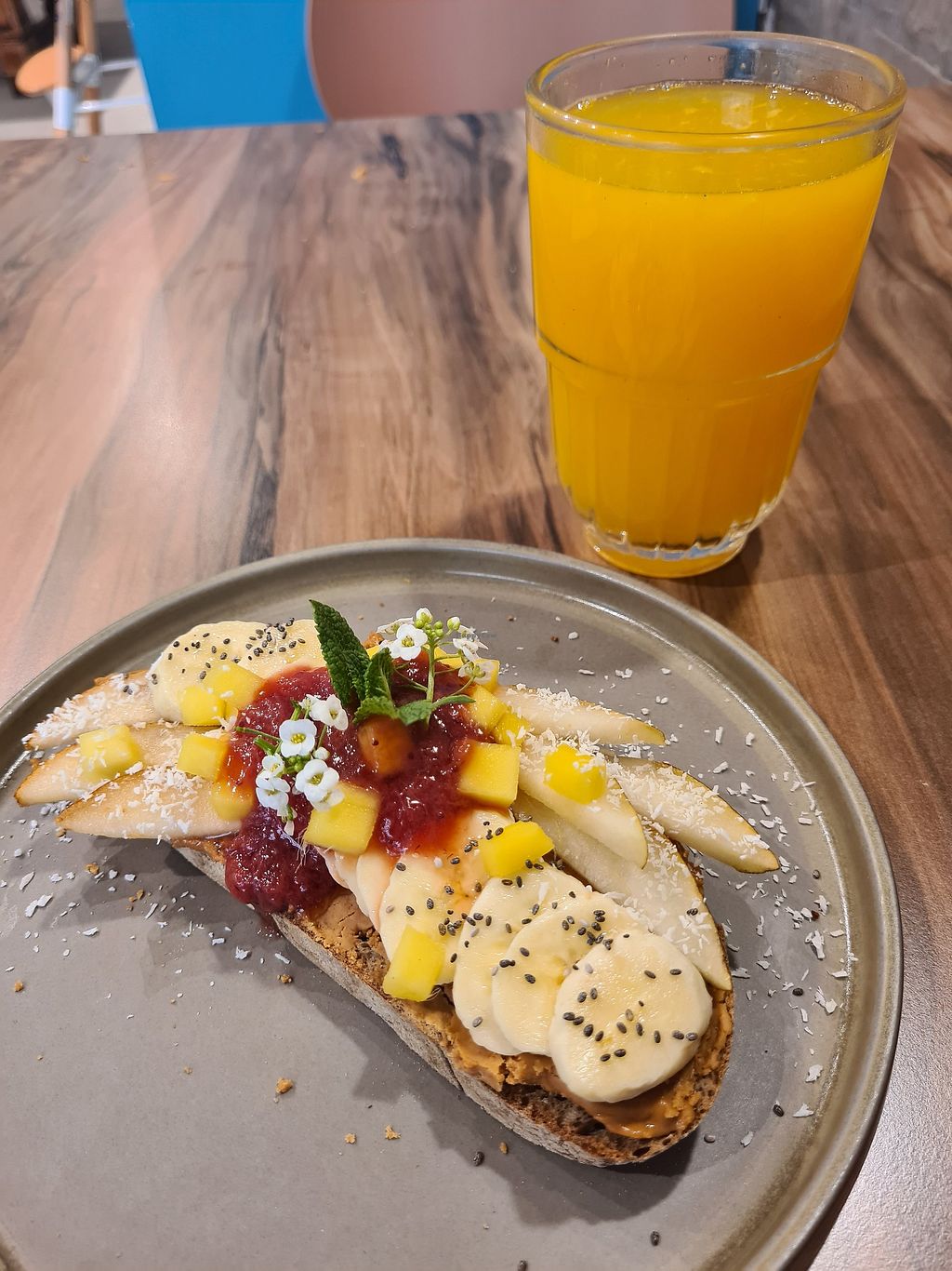 Probé la tostada de aguacate, el zumo y el café y estaba muy bueno. Muy cerquita de la estación de tren de Joaquín Sorolla