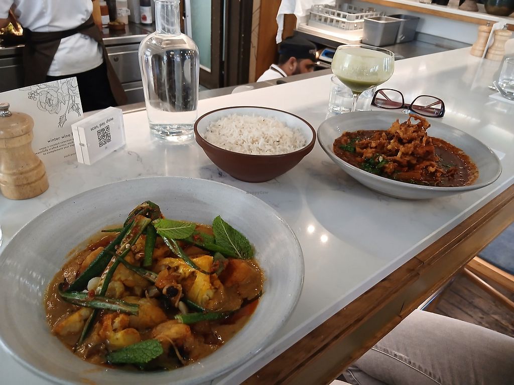 1) The menu is unnecessarily obscure for English-speakers - why not explain what the dishes are, like stew, curry, potato balls, etc., so we don’t have to waste time looking up the meaning or asking the server (labneh, bonda, shatta, dhaba, shan, pasanda, fattoush, estofado, gremolata, hispi, poriyal and more).