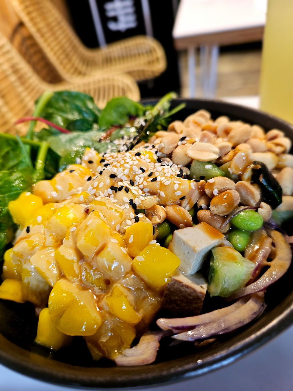 Serves meat, vegan options available. Poke restaurant offering vegan friendly bowls including sesame tofu, spicy tropical tofu, and more. Open Mon-Sat 11:00-21:00, Sun 12:00-21:00.