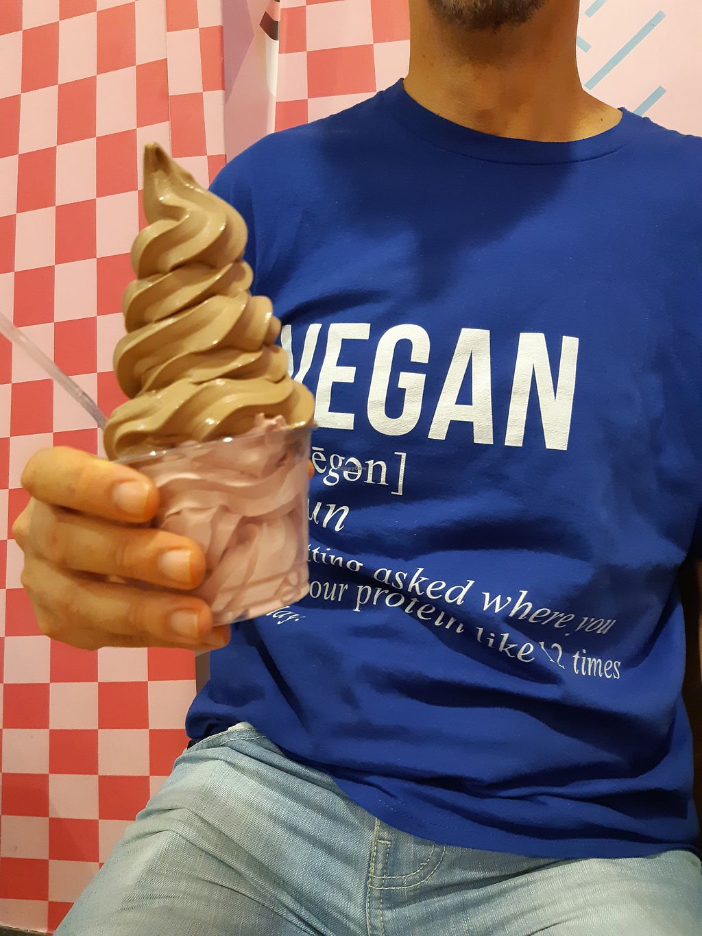 Excited to find this ice cream shop with many vegan options. Six soft-serve vegan ice cream flavors and literally over a dozen shake, smoothie, and waffle options.
