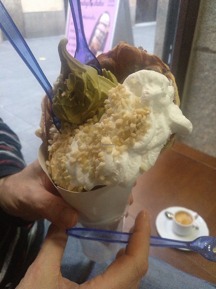 Por nueve euros te tomas el postre más grande y rico del mundo: gofres, tortitas, decenas de helados de todo tipo de sabores... Súper recomendable probar la «galleta María» vegana o la «nutella». Personal súper majo.