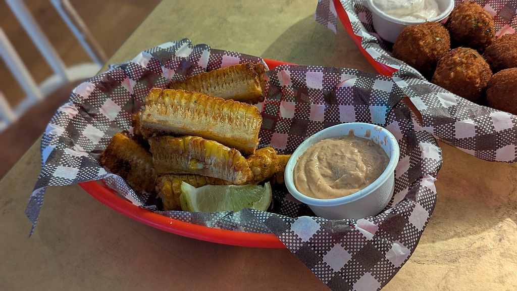 A bar that only serves vegan food is great! We went on a Saturday evening. We wanted to eat fish and chips but unfortunately, they were sold out. The calamari and popcorn chicken I ordered instead were delicious.