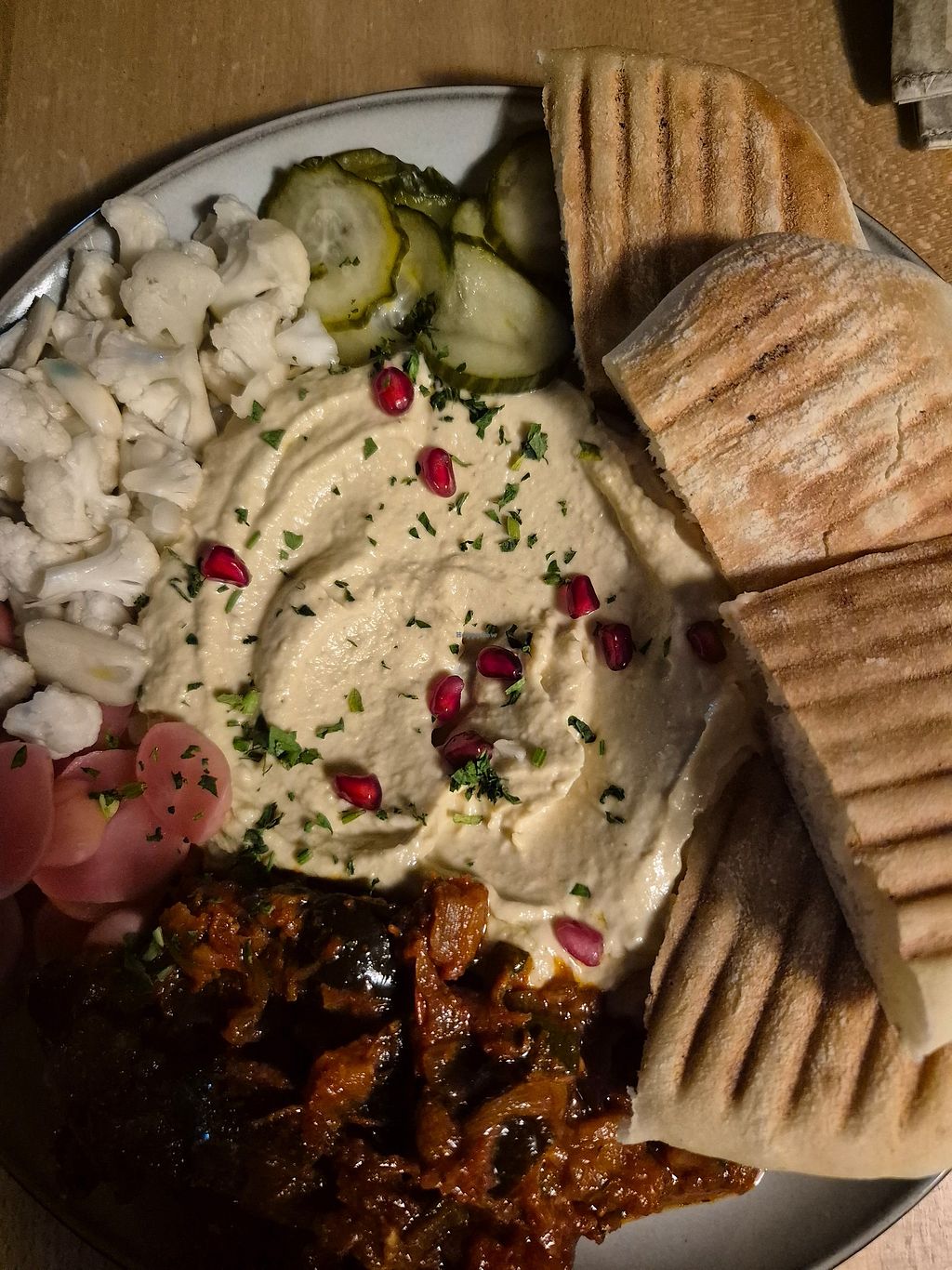 I had the mezze platter with hummus and warm pita bread, pickled cauliflower, etc. It was very good. The restaurant is also quite nice; it has two floors.