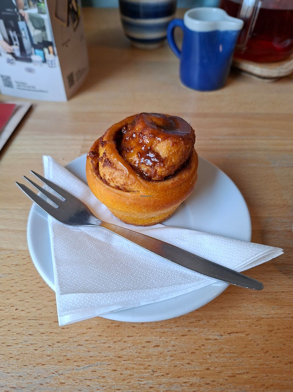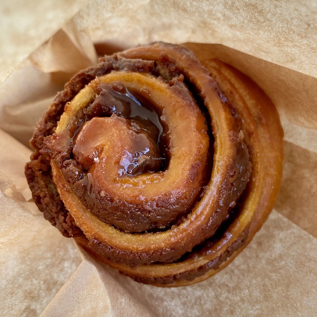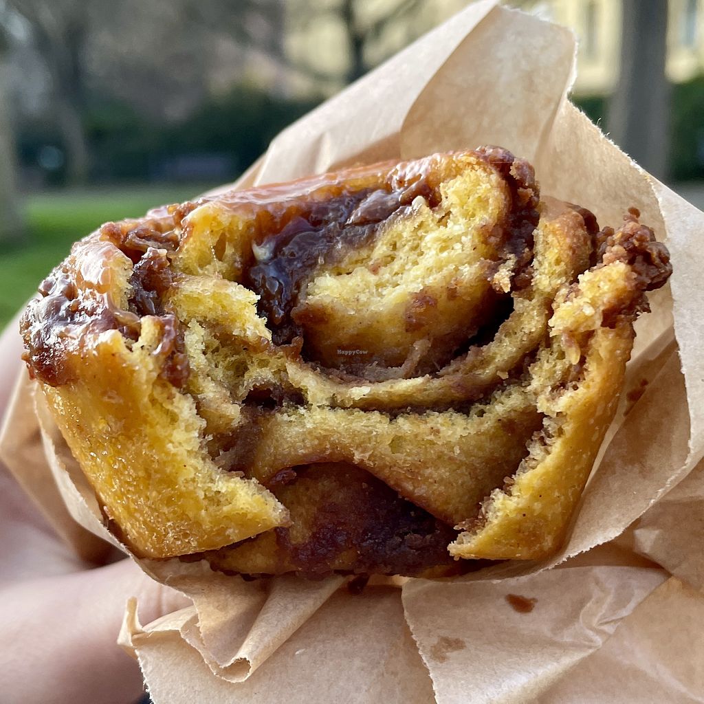 Tasty vegan sweets, cinnamon roll was delicious! Few wobbly tables outside.