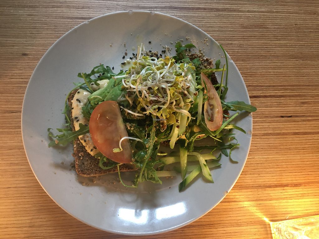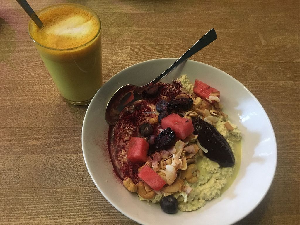 Had the vegan breakfast plate which was nice with lots of fruit, veggies, spreads and bread. The Ayurveda porridge was disappointing, almost no toppings. It would be better with more fruits/berries.