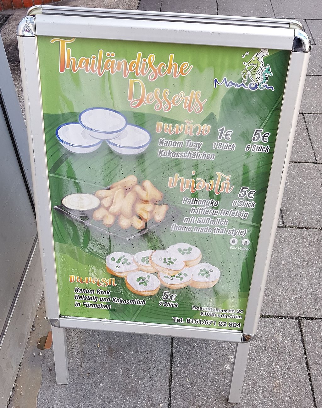 Small booth where boba, Thai iced tea and three types of Thai snacks are sold, two of them are vegan (kanom tuay and kanom krok). Reported closed July 2025.