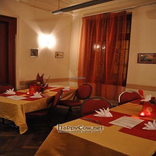 Nice place, decorated in red with friendly staff. They hold yoga, meditation and acting classes in the side room (depending which night you go). Though it is behind closed doors. The menu is in Romanian without English translation. The staff helped me decipher what was vegan. All is vegetarian. If you see a P with a circle around it - that item is vegan. It is really indicating that the meal meets the Orthodox religious criteria for fasting prior to the holidays (when they give up meat, milk and eggs). I had the red soup (which was tomato with rice, carrots, small diced potatoes, and parsley) and the falafel. Both were very good. It was nice to have soup, since as a vegan I can rarely trust it at a restaurant (most non-veg restaurants use beef or chicken broth). There was dance music playing in the restaurant, but no dancing - since I was the only one dining on this Tuesday night.