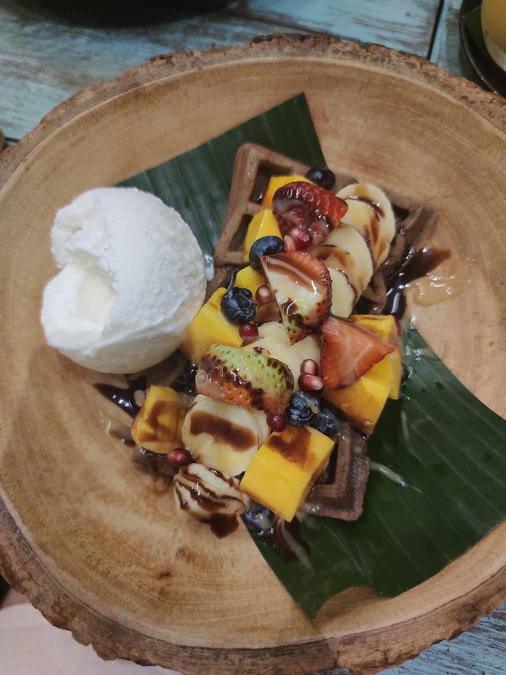 Vegan Chocolate Waffle with Coconut ice cream and fruits