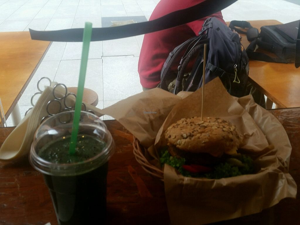 quinoa cheese burger and smoothie.