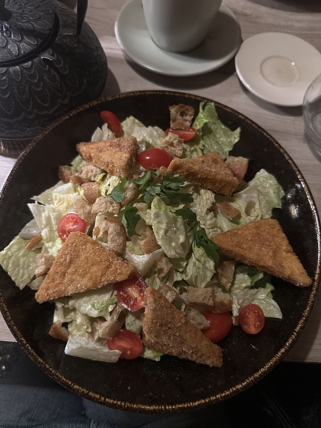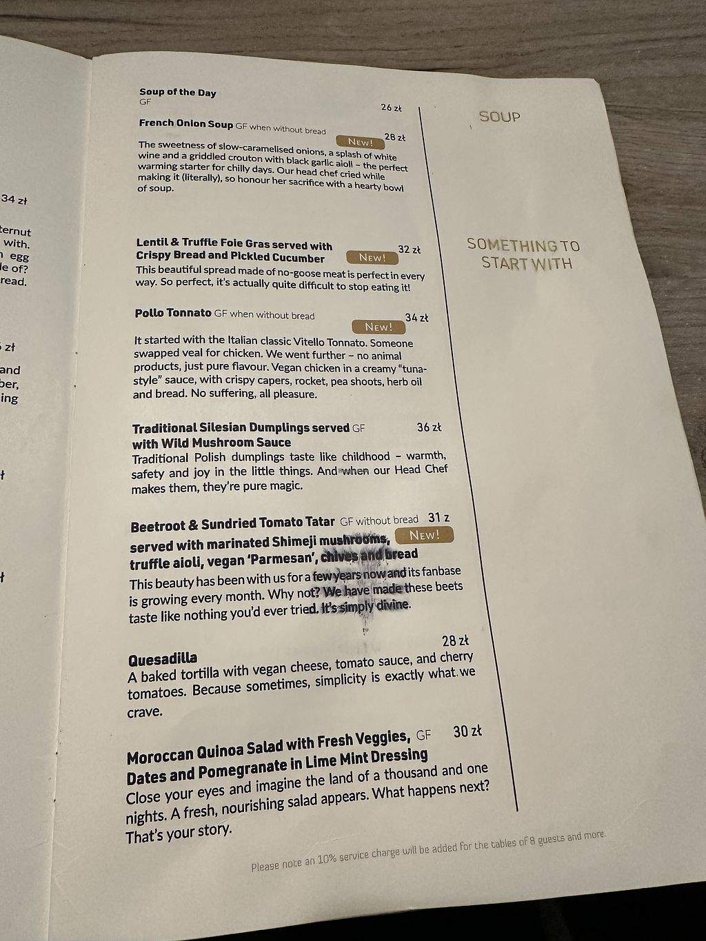 The most amazing vegan restaurant we went three nights in a row and there was something for everyone. The menu is varied and has a mix of polish and international dishes. If you prefer vegetables, tofu, fake meats there is something for everyone! The 3D printed steak is amazing! We tried the ramen, burger, cauliflower steak, Caesar salad, french onion soup, foie gras, pollo tonnato, dumplings, beetroot tartar, tiramisu , cheesecake and pannacotta. Everything was amazing even the simple side of garlic spinach was delicious. I like that you can add extra tofu, vegan chicken or vegan duck onto meals. The only thing that wasn’t as great was the dumplings - the sauce was delicious but the dumplings themselves were a bit odd. The teas were lovely I really recommend the maple and walnut oolong - tastes like maple syrup. The flat white is great too. The staff are always so lovely and the interior is great. Upscale restaurant but fair prices. I can’t recommend enough - we stayed in gdansk for three nights and ate here for three dinners in a row!