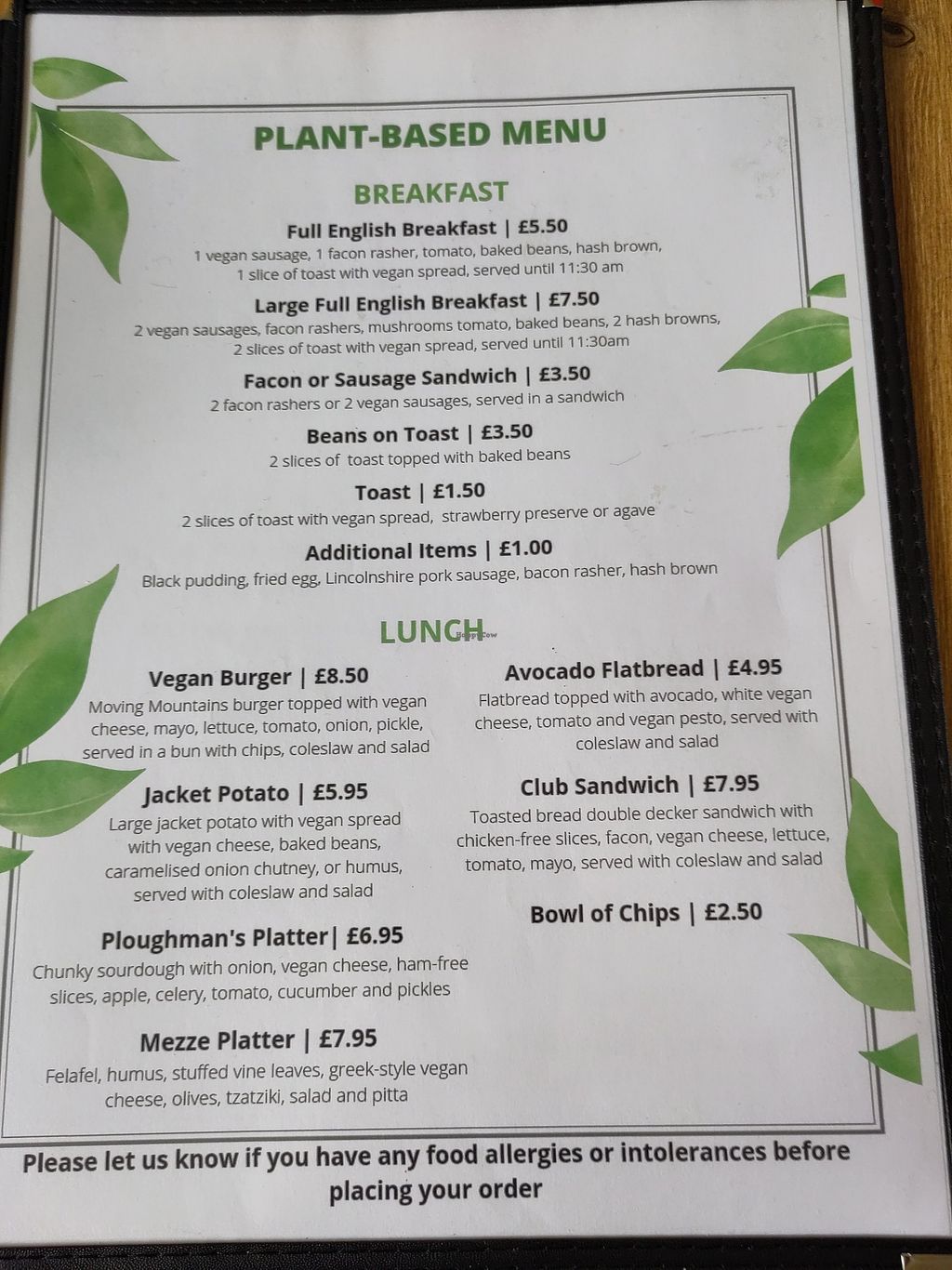 Serves meat, vegan options available. Cafe at the golf club with vegan cooked breakfasts and brunch, sweet and savory waffles and crepes, cakes and bakes, teas, coffees and hot chocolate. Previously located at Market Place. No longer fully veg since Nov '22. Reported closed January 2024.