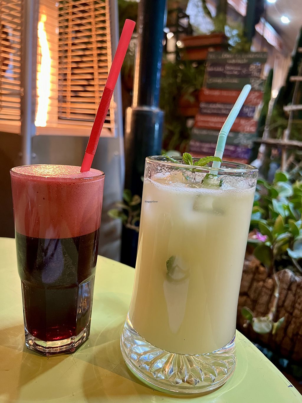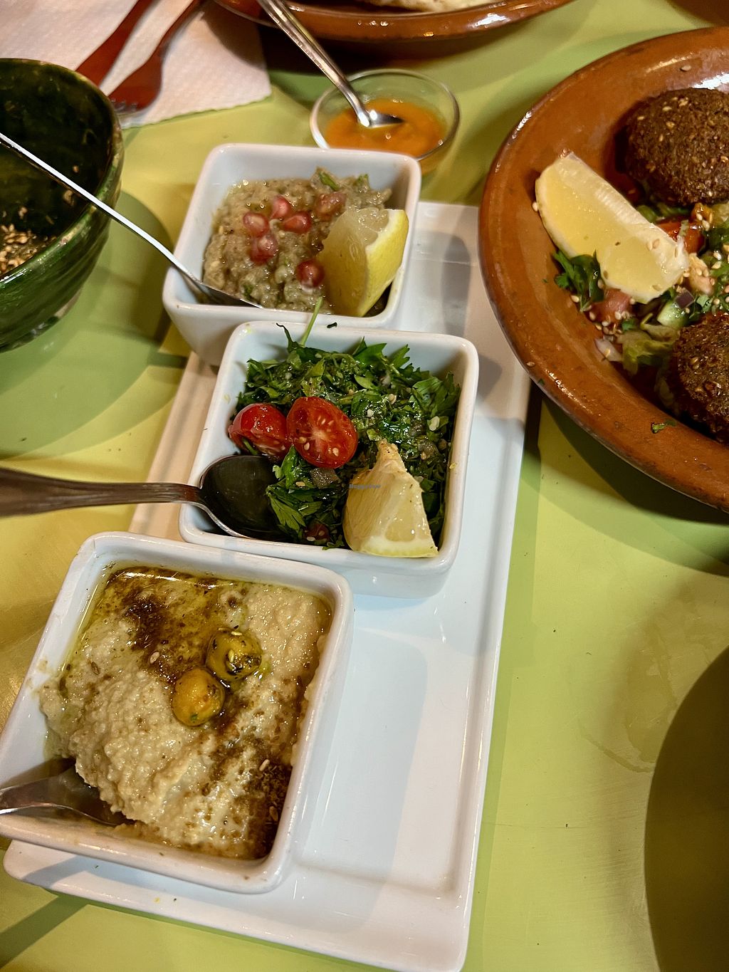 They serve Middle Eastern/Lebanese food. The small menu is in French and English and they have a number of vegan options: vegan soup, falafels (original & beetroot ones), Mezze- babaghanoush, humous & tabbouleh. We got a mix of falafels and a trio of mezze. The portions are quite small. The tabbouleh didn’t have many grains in it. We also got some juices which were good.