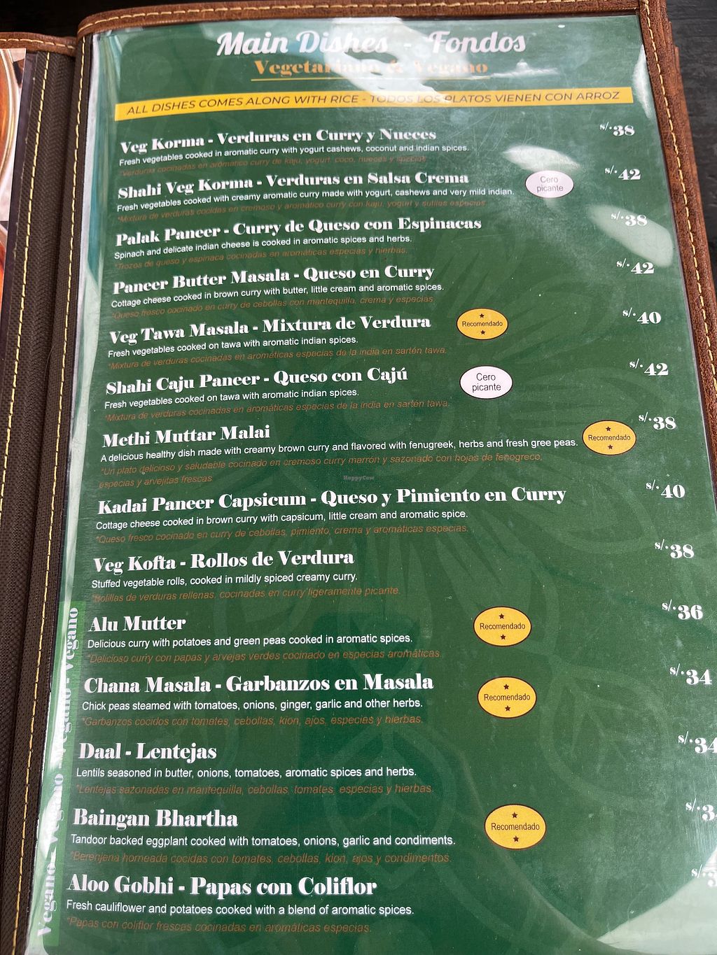 A lot of vegetarian and vegan options. I had samosas, vegetable cakes with mint chutney and tamerian. my course was the vegetable kofta. excellent! so many cleaning spices - whole pieces of clove and a lot of cilantro (good to eat while in south america - detoxes heavy metals & parasites.) the service is friendly. the man even walked me to the bathroom - which was probably the cleanest bathroom I've used in south america. expensive - but great quality.
