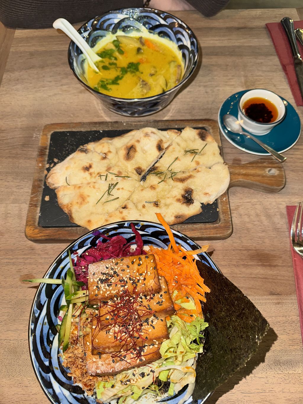 We stumbled upon this place on a Tuesday night, only a minute walk from our hotel and decided to check it out. They have an open mic Tuesday nights so they only serve the lunch menu all day, and have a decent amount of options. Got the Tom Kha soup with tofu, rice bowl- no egg, the Pinsa Apero: sourdough focaccia and their homemade chili oil. We loved our meal and the staff was very friendly, so we decided to come back for dinner the next night. Got the miso eggplant and mapo tofu. Their tofu is VERY good. Nice to find firm tofu actually seasoned well!