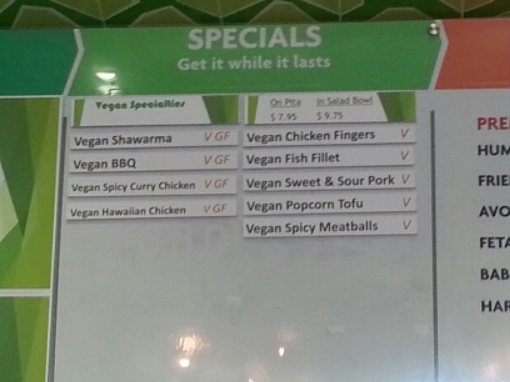 Part of international fast service falafel restaurant. Mostly vegan with vegan shawarma, BBQ, soup, falafel, pita, and unlimited salad/toppings bar. Drinks are fresh squeezed orange, carrot, apple juice. Reported closed, Feb 2017.