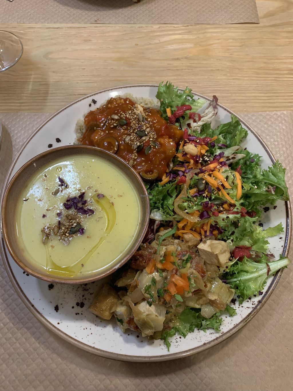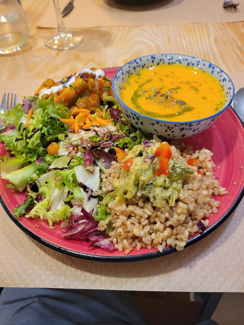Read moreI had the Plato Mapa Verde, which today was a small bowl of carrot and sweet potato soup on a plate with rice & pesto vegetables, stewed chickpeas either tempeh, and salad. The flavours were great and it was very filling.