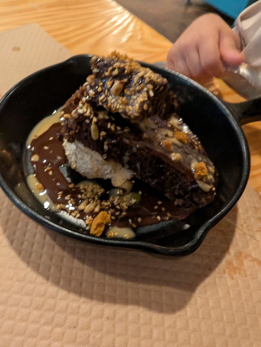 Everything we had was very good — the starter, which was potatoes with alioli sauce, as well as the main dishes: the jackfruit roast and the chickpea soup. We also tried three desserts — the cheesecake, the brownie, and the cookie mousse — and they were all excellent. The atmosphere was great, the staff was friendly, and they had both high chairs and changing table for babies. A perfect 10.