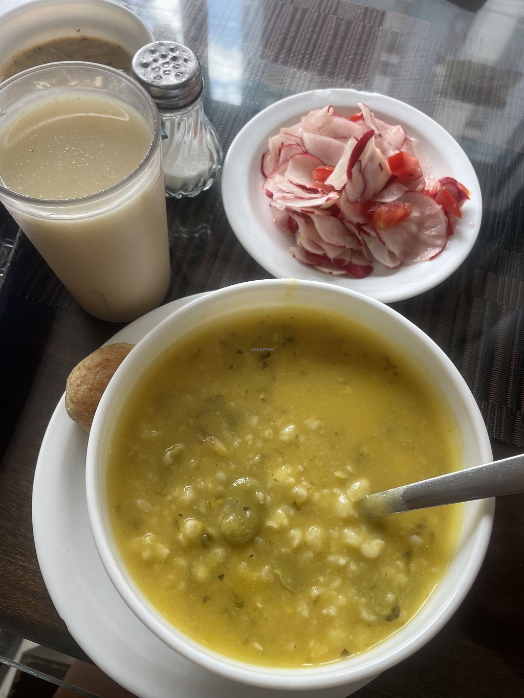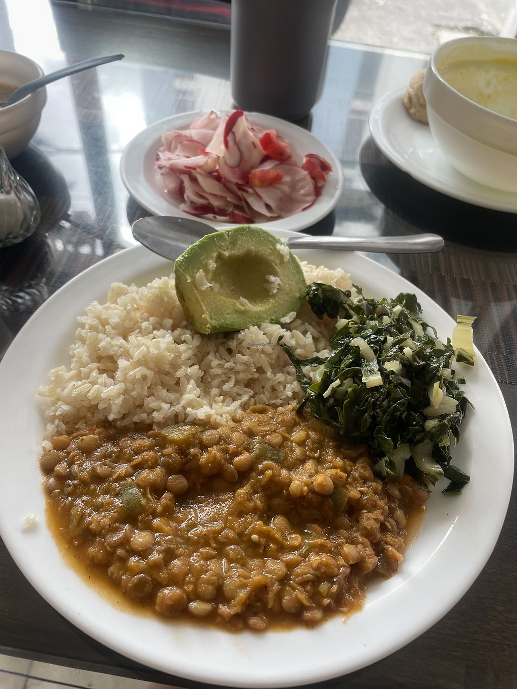 Churrasco with seitan (without egg). Comes with salad and drinks.