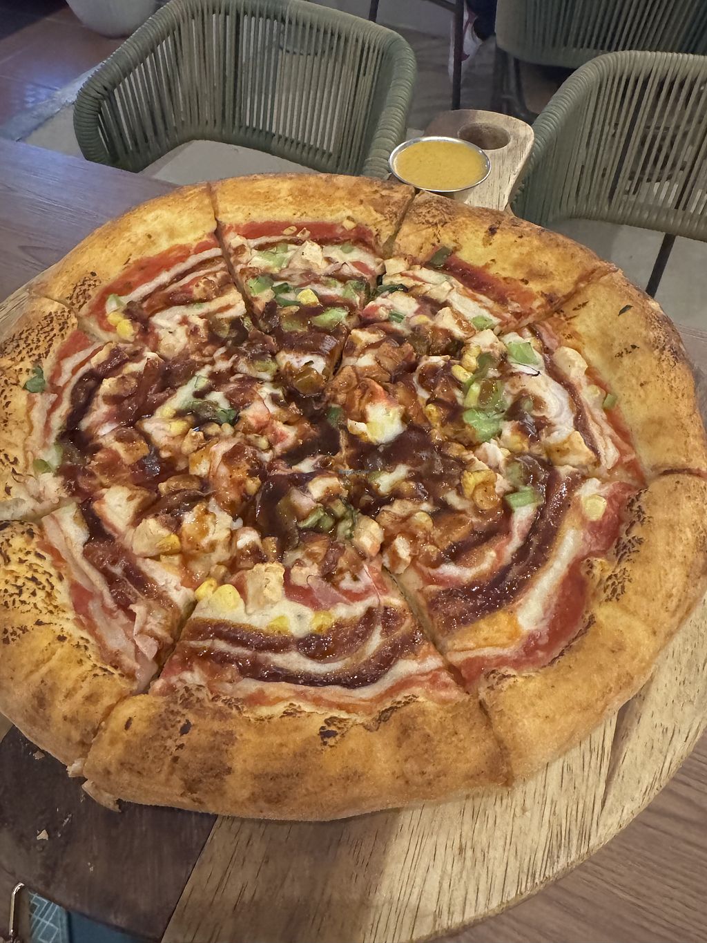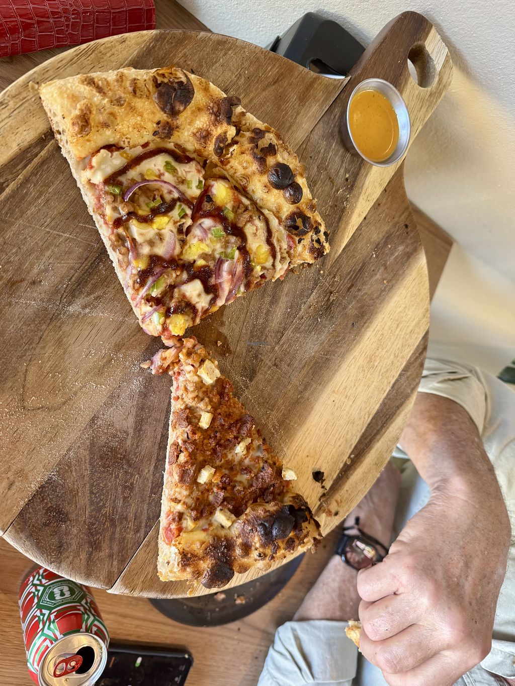One side with “chorizo” pineapple and jalapeño, the other with “chicke…