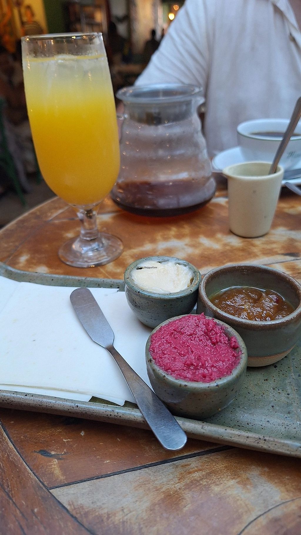 A opção vegana era um café completo com suco, café com leite vegetal, iogurte com morango, pão com manteiga, queijo VidaVeg e geleia. Estava gostoso, porém nada demais, bem simples e um pouco caro.