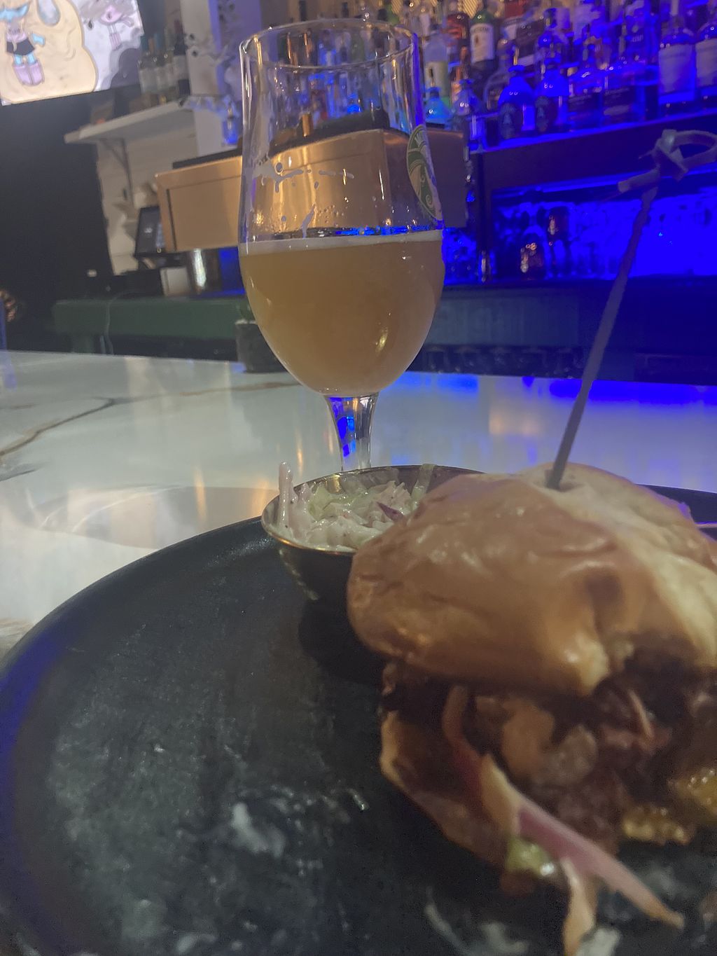 Low key Sunday evening with relaxing music, helpful and friendly staff helped me enjoy the tasty BBQ brisket sandwich even more (ordered the coleslaw, which was pretty good). As another person noted, the portion wasn’t big but for me it was enough. I didn’t try any cocktails but the wide selection of these and local beers is impressive.