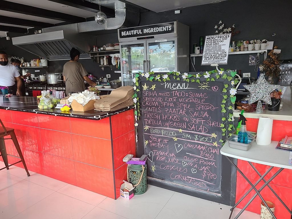 An all-vegan restaurant serves POTDs (Plate of the Day) with a new dish each day. There isn't a set menu - not in the conventional sense. She always has a cookie/sweet treat, cornbread, and usually some special juice, along with the international plate of the day. The restaurant encourages us to be "food curious." Reported closed May 2024.