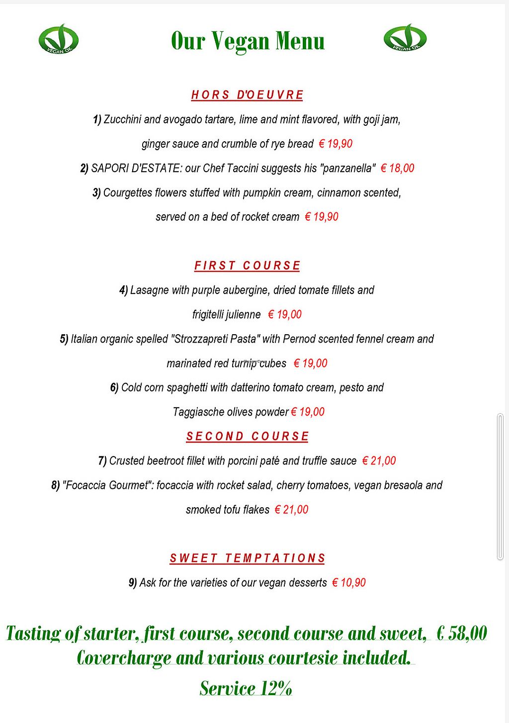 Separate vegan menu with appetisers, first course, main course and desserts. Around 12 options total. Service was great and food was amazing, but it's on the price side, even for venice. I had the paccheri past first course, vegan cordon bleu second course and the strawberry soup with ice cream for dessert. All my meals were amazing.