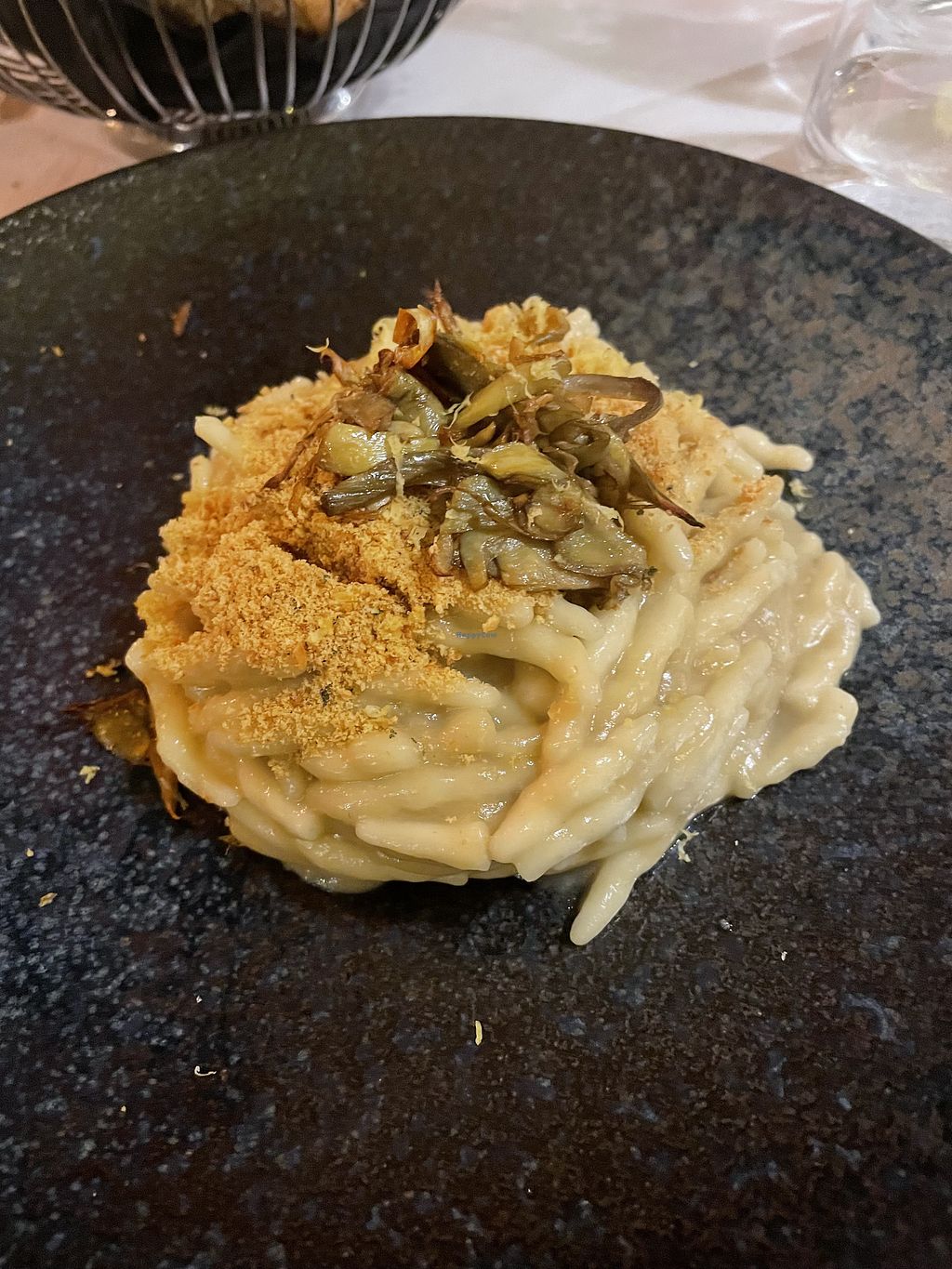 The prices are high (55 Eur per person with one shared appetizer, one first course dish each, a glass of wine each, and some water).