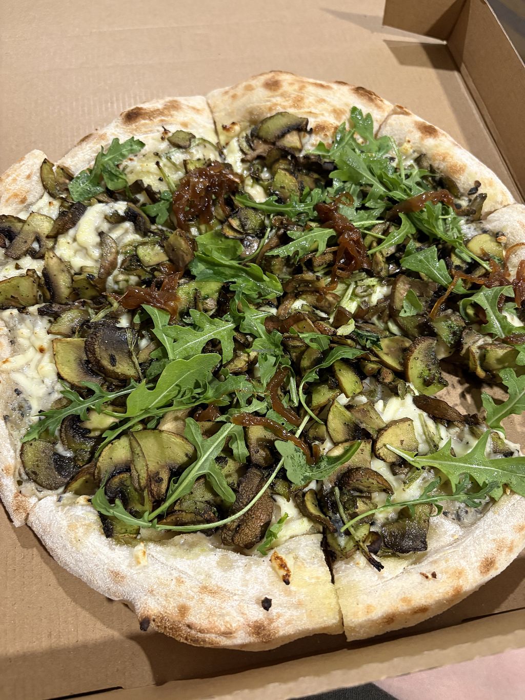 I just had their mushroom pizza with vegan cheese and truffle sauce. Is so good!