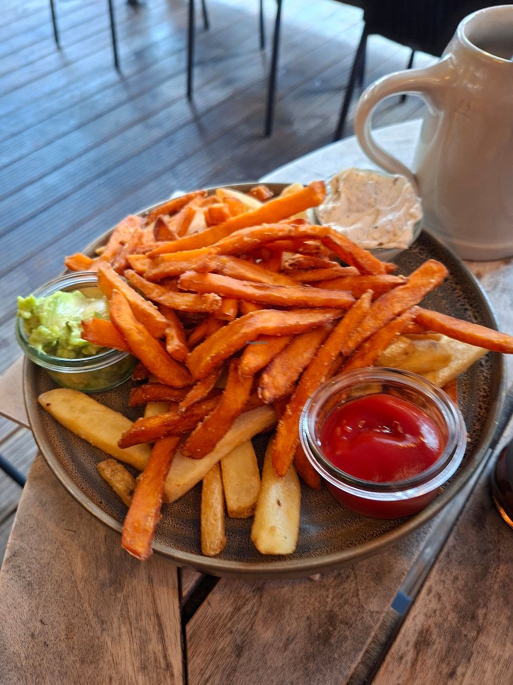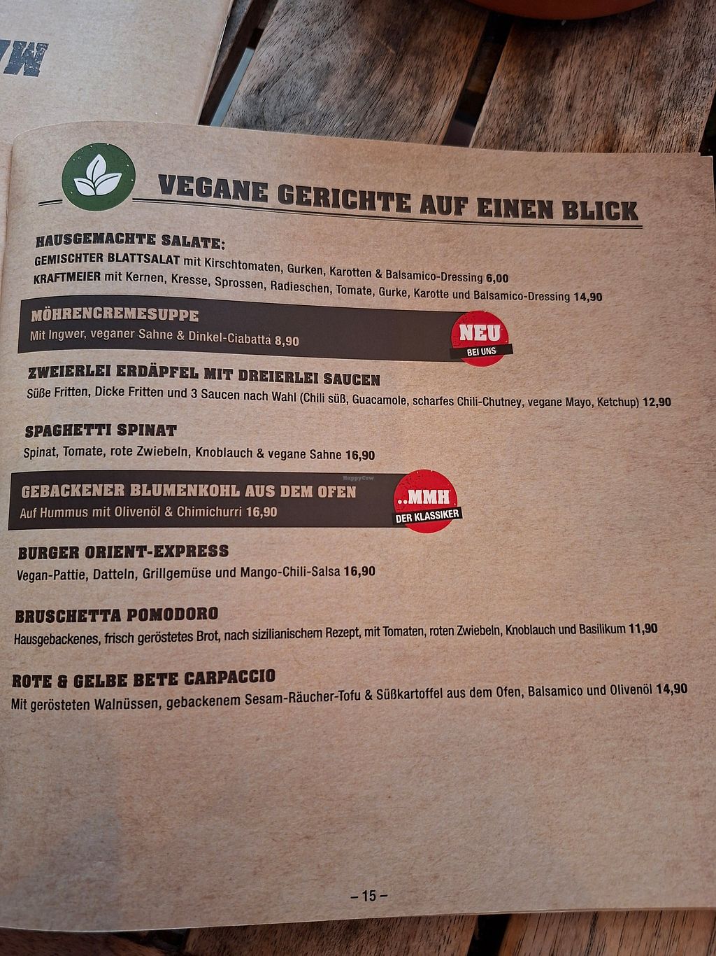Serves meat, vegan options available. Restaurant and bar with a separate vegan menu section. Choices include fries, pasta, baked cauliflower, burger, and soups. Open Mon-Sun 11:30-23:00.